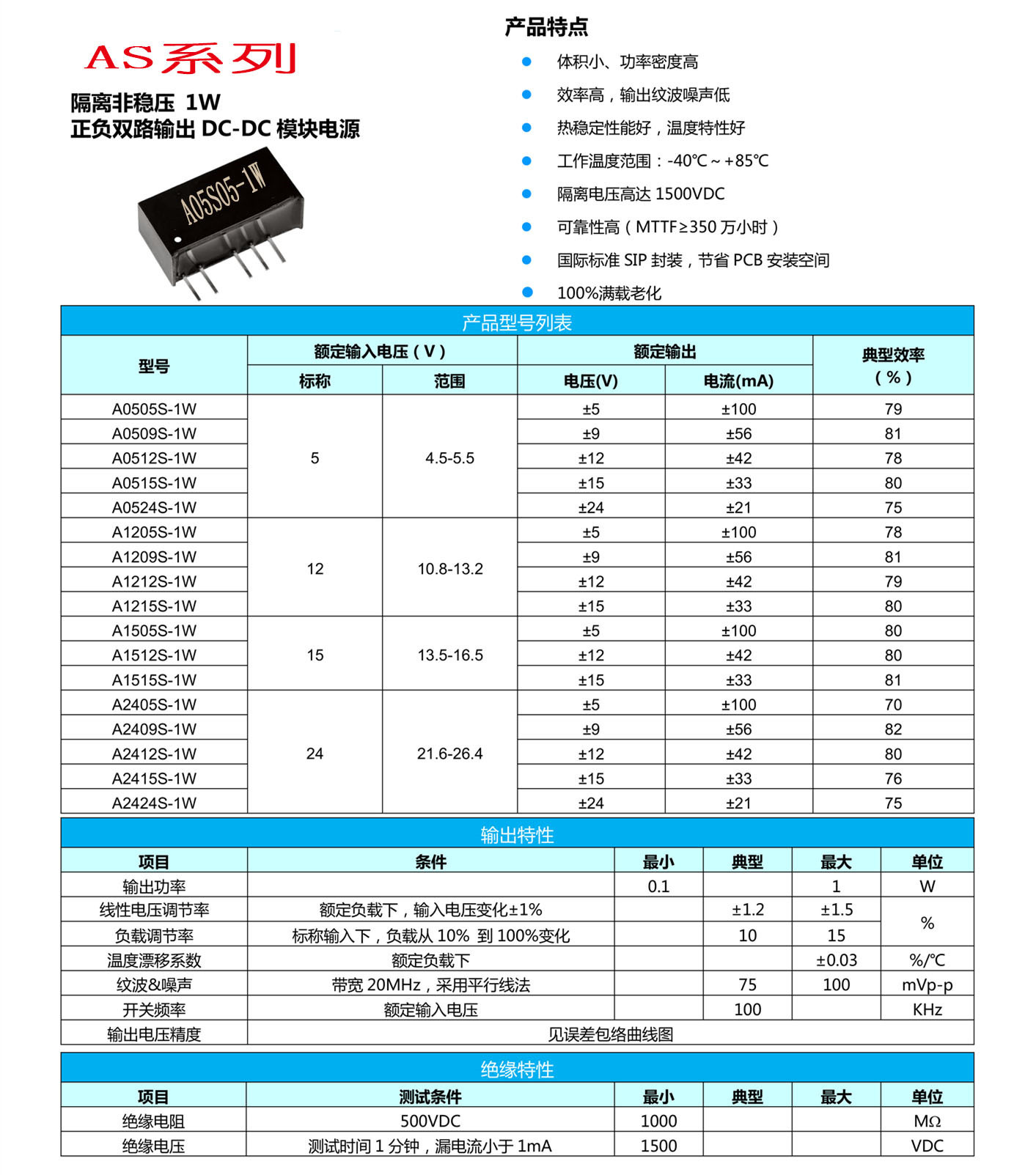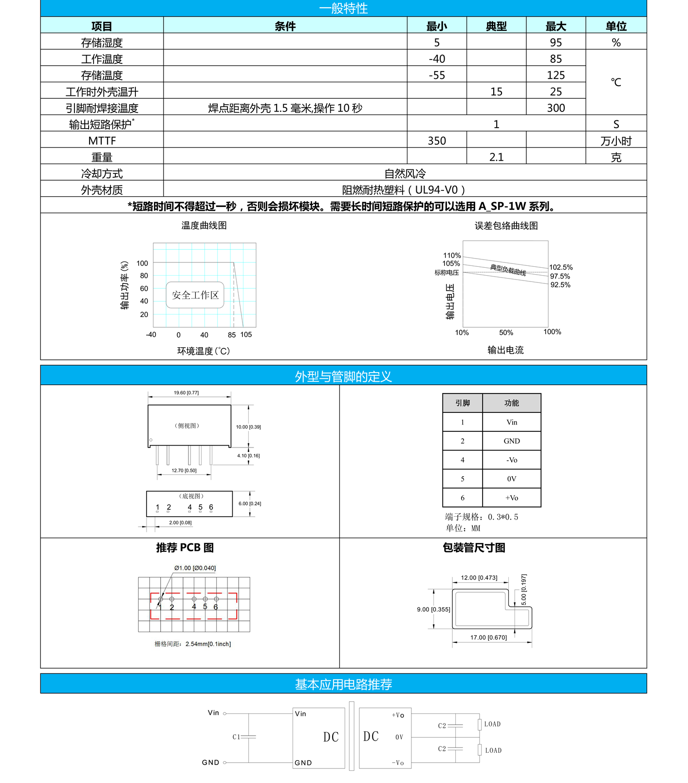 典型性能:该系列产品采用标准SIP单列直插式,输出功率:0.1W~3W单路、双路输出,输出低纹波噪声、高稳压精度、长期短路保护自恢复、使用效率高,高隔离耐压;