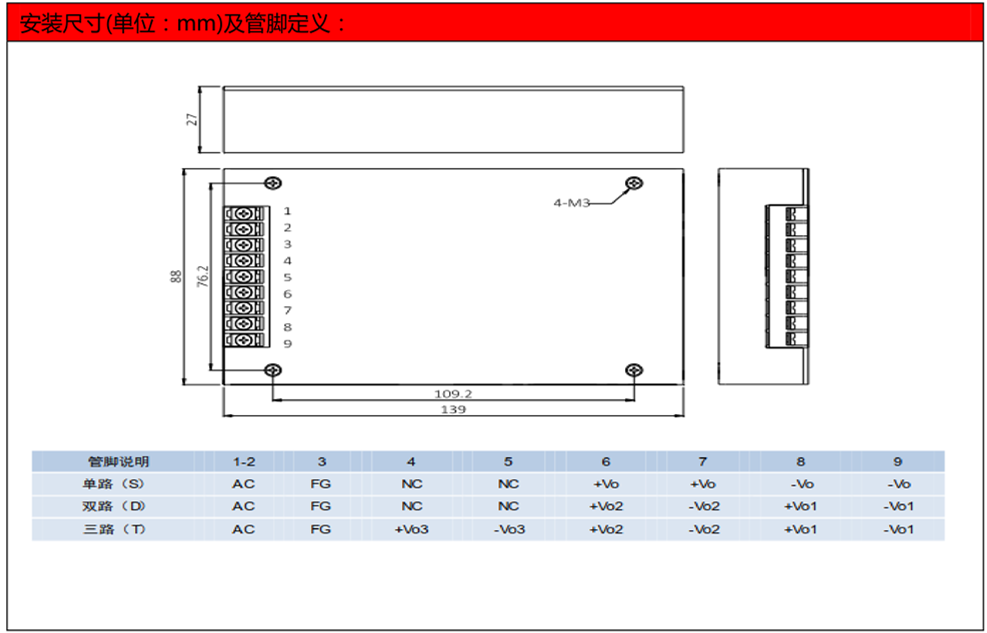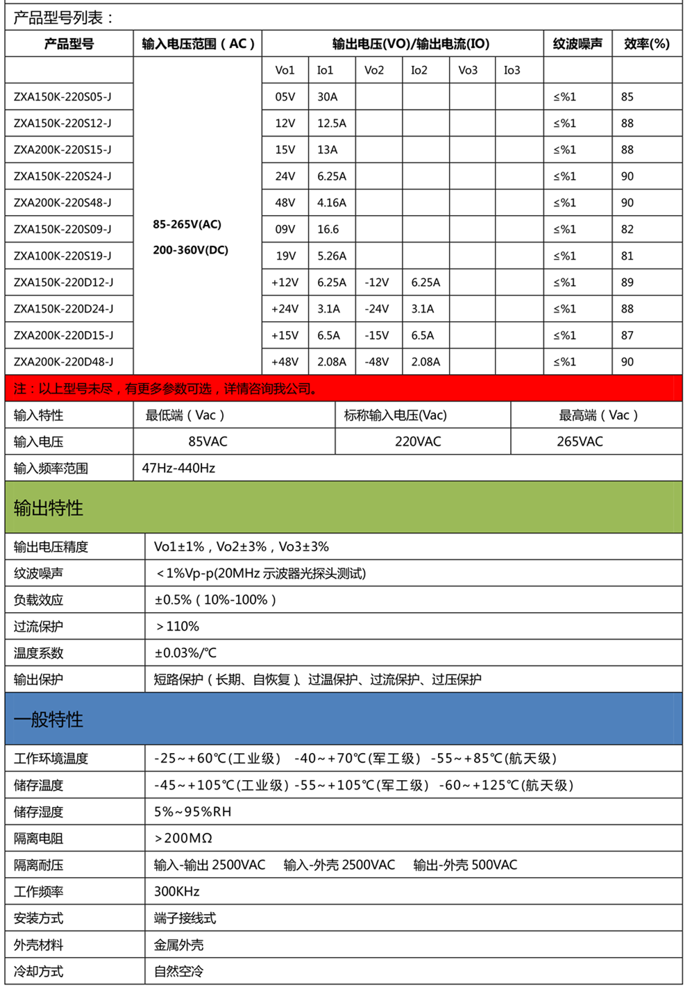 宽电压输入范围:85-265VAC或200-375VDC输入浪涌抑制电路低噪声