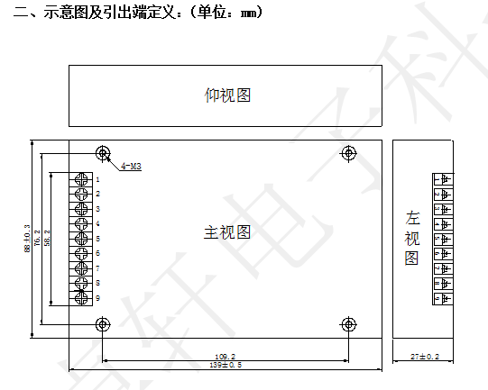 管脚定义:未注尺寸公差按GB/T1804-2000 m级,铝壳,表面氧化处理